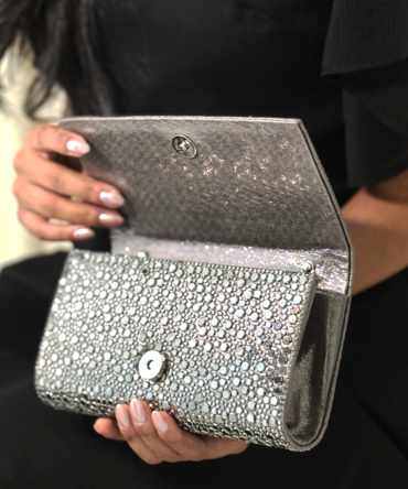 Complete your look with the Tina Bag Black Sparkly Clutch. The perfect evening bag to match your Tina sparkly pumps.