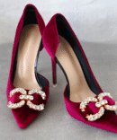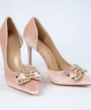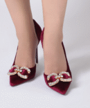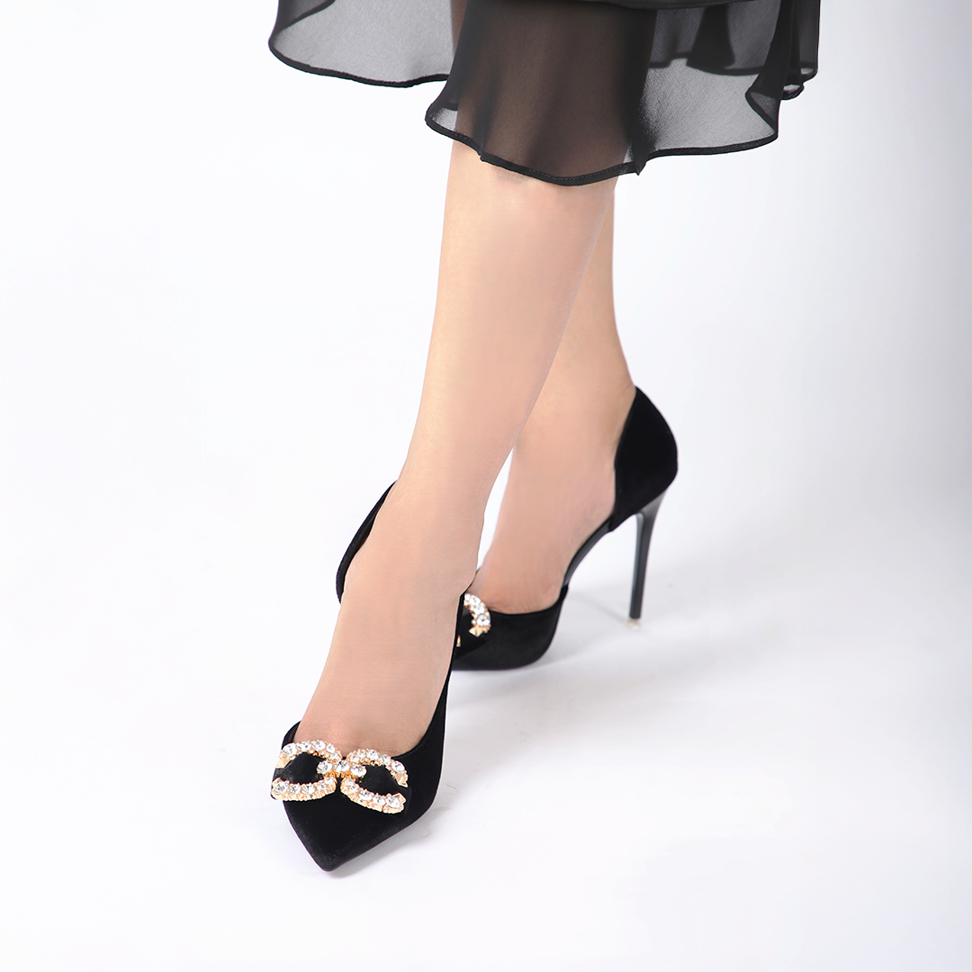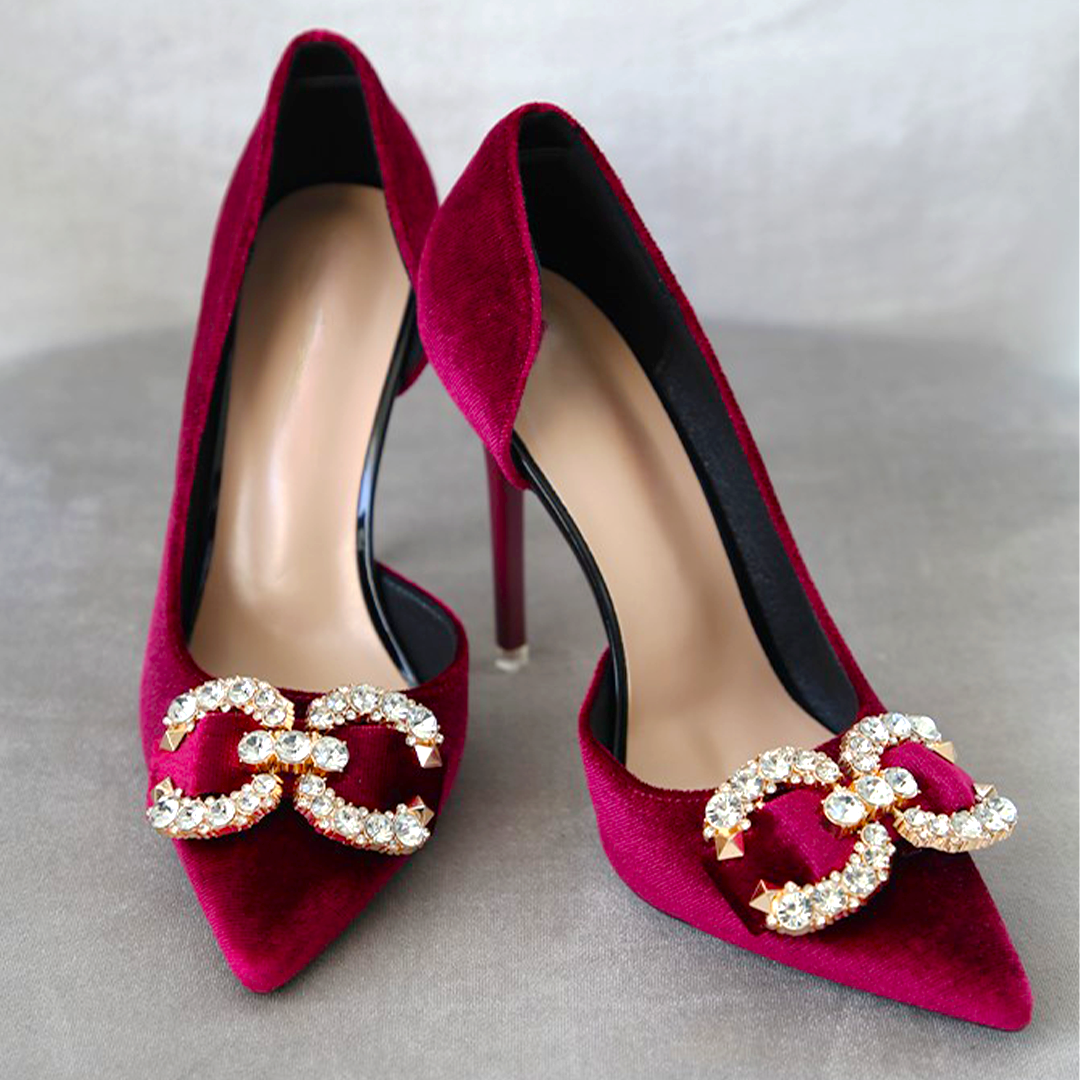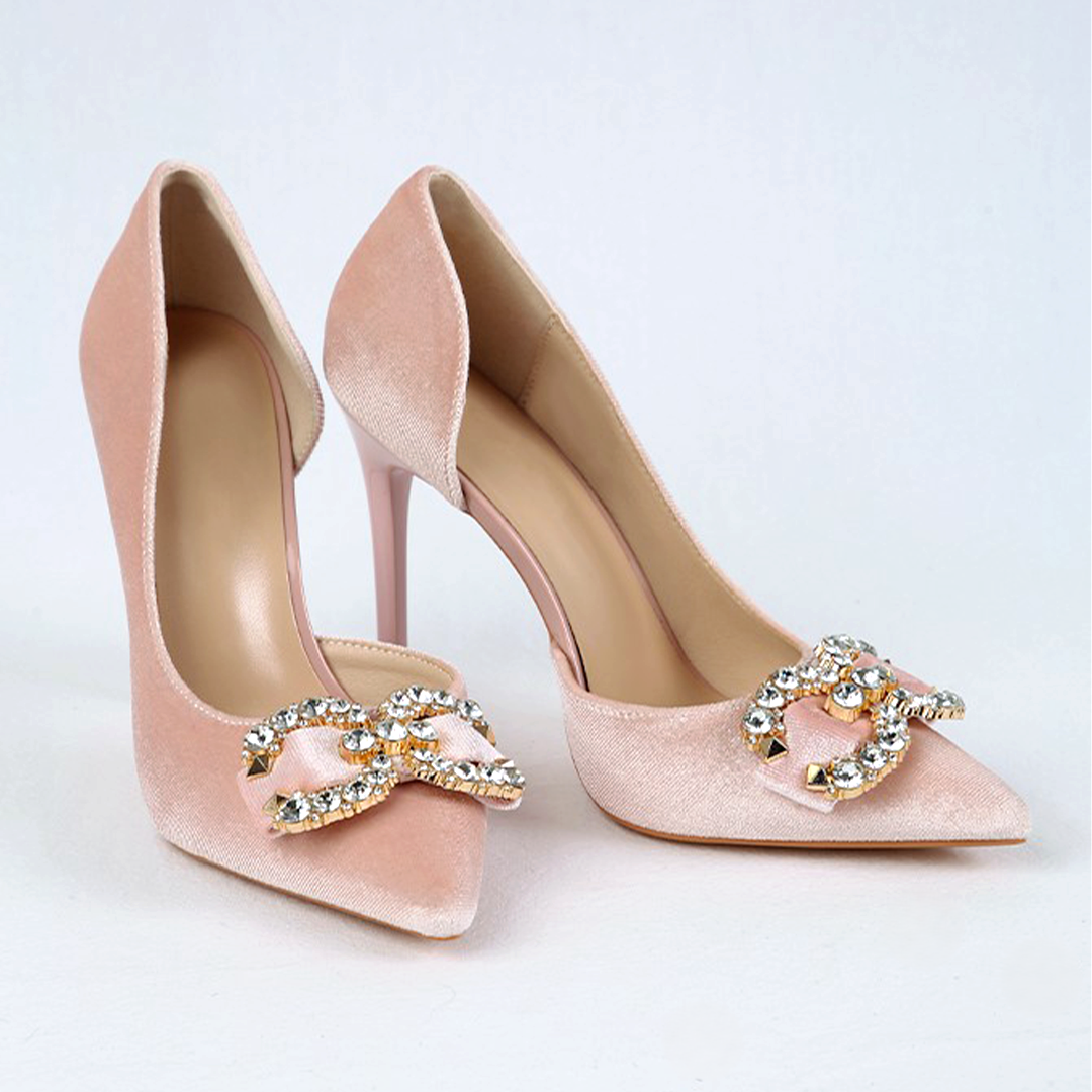 Achieve ultimate glamour with Mrs. chic Velvet Crystal Shoes. Features 11cm heel. Available in Black, Cherry Purple and Light Pink.